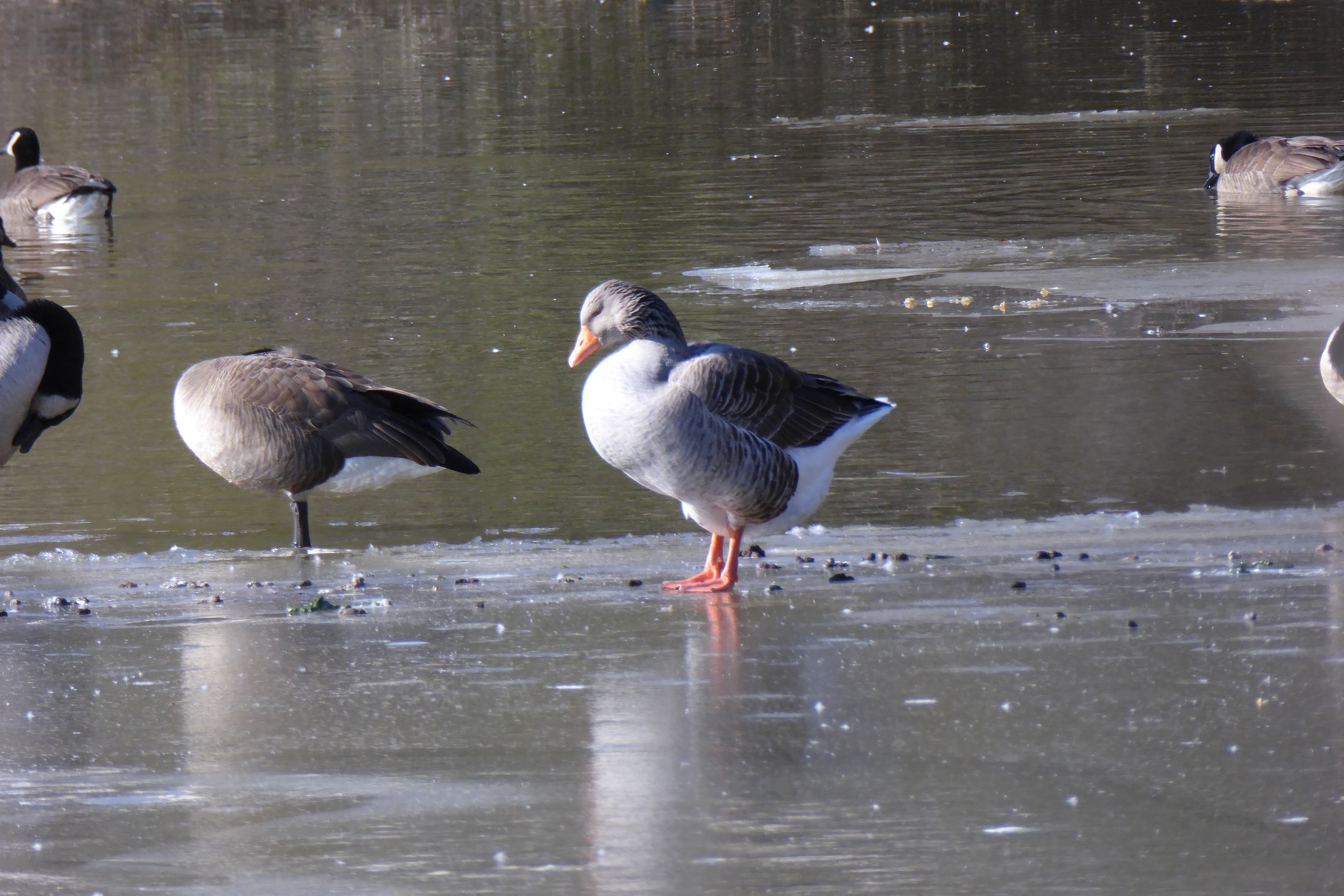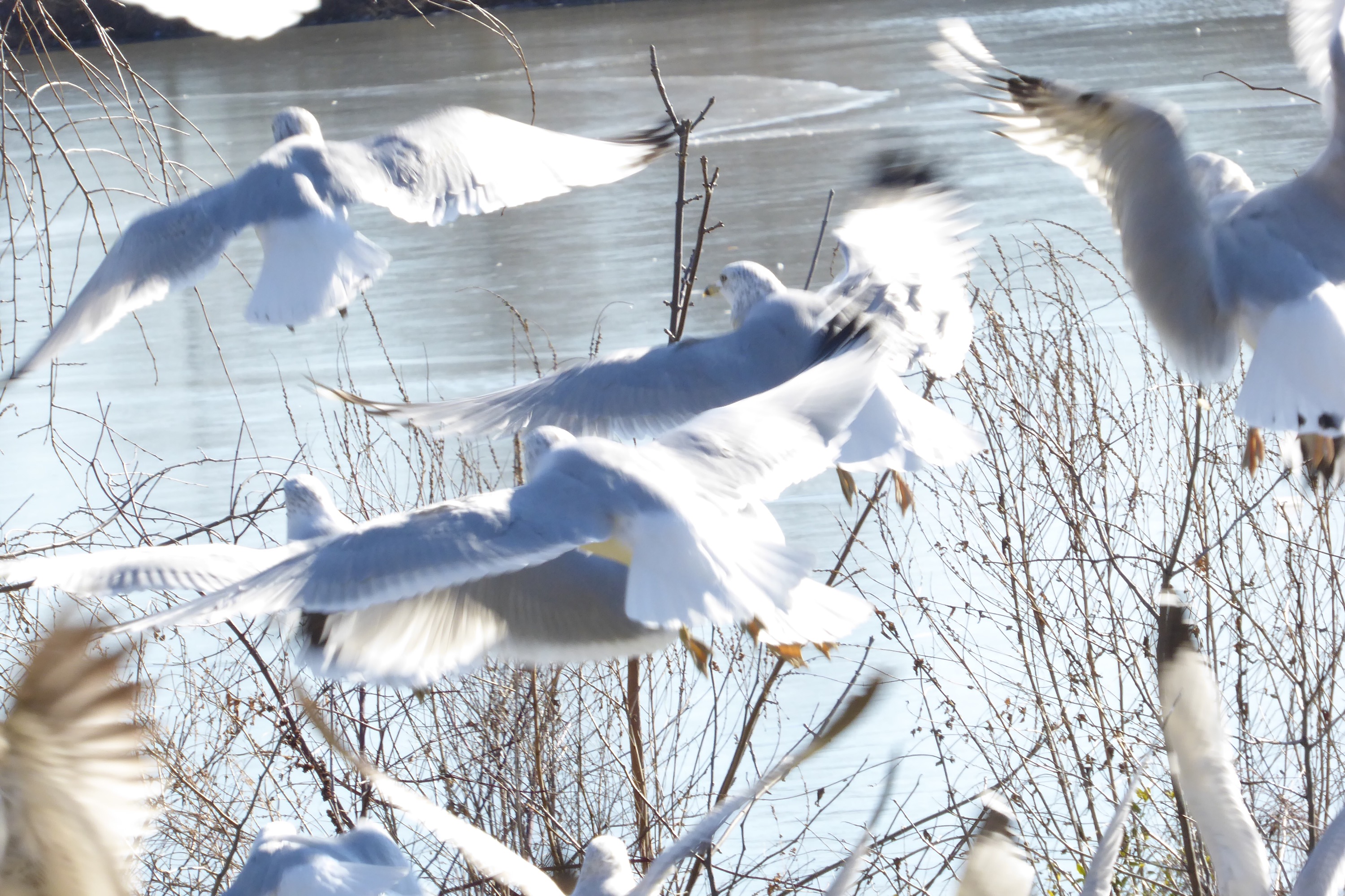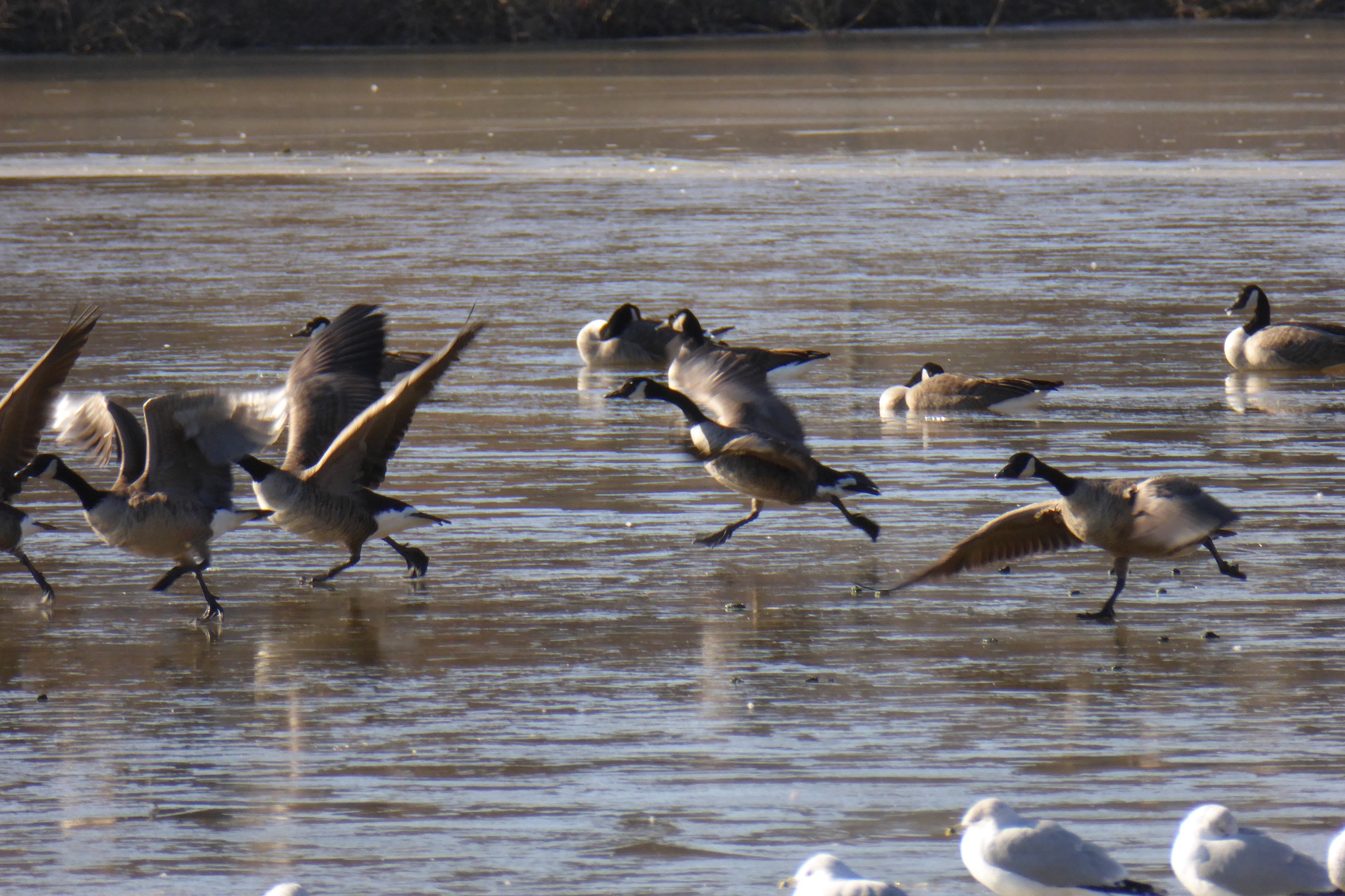 Well January is proving to be a chilly month if not snowy. The Lakes and pond have thin (or I think it’s thin) sheet of ice. It warmed up enough for some melt to happen. The geese are taking off from the ice. Amazing I would have been sliding.