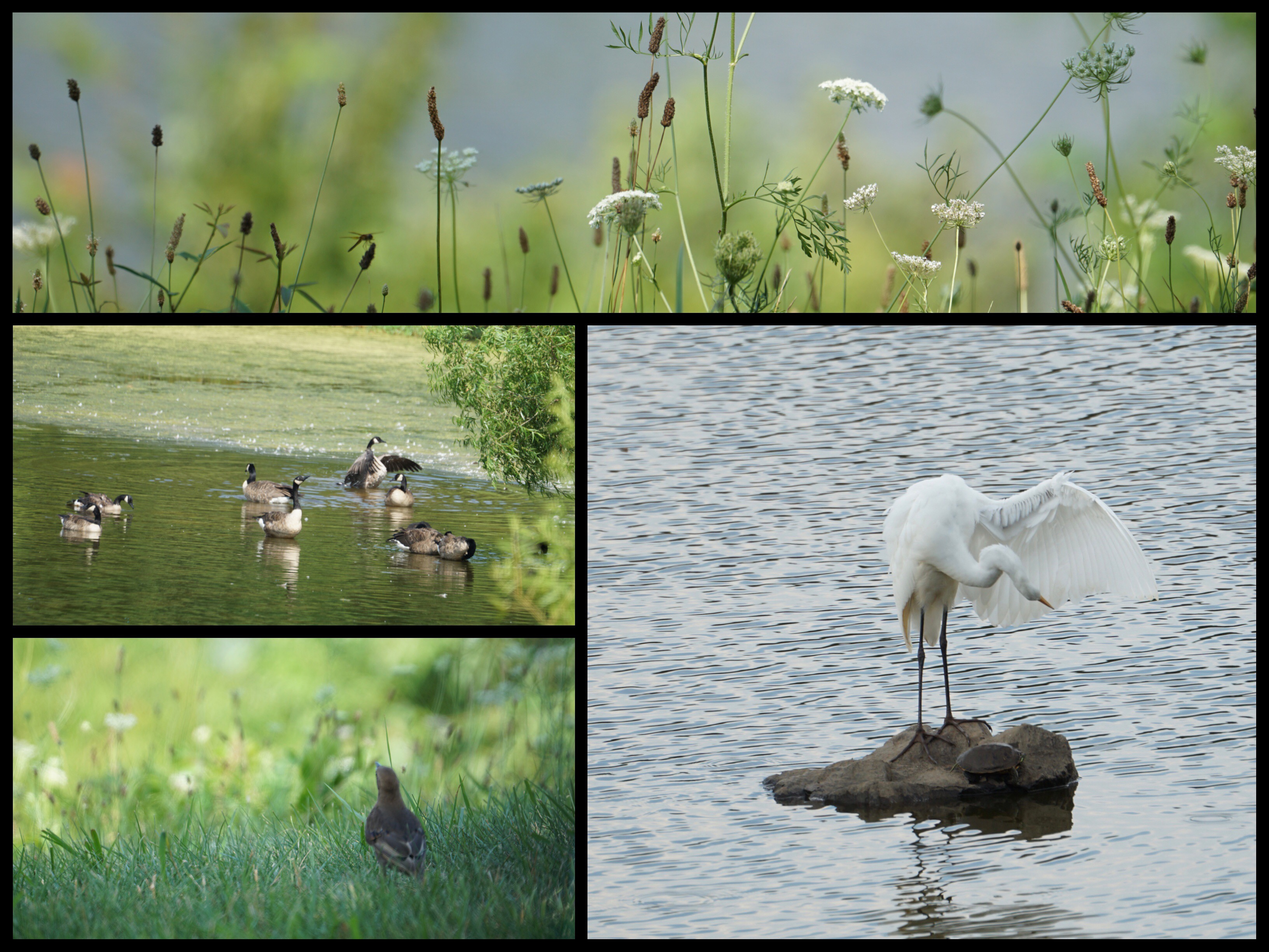 It was a hot summers day and many birds were taking advantage the water around the wading ponds large and small. The egret spent some time preening and the turtle remained motionless.